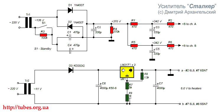 Я перепробовал все популярные методы борьбы с фоном. Результат с объективной т.з. был отличный (уровень шума -90 дБ), но субъективно звук был немного грязноват. Поэтому для питания накалов применен стабилизатор напряжения. Максимально допустимый ток для LM317T составляет 1.5 А, поэтому использовано праллельное включение 2-х микросхем. Такой вариант совершенно безопасен, т.к. LM317T имеет встроенный датчик температуры кристалла, который выключает стабилизатор при перегрузке. Обе микросхемы установлены на радиатор от процессора Athlon.