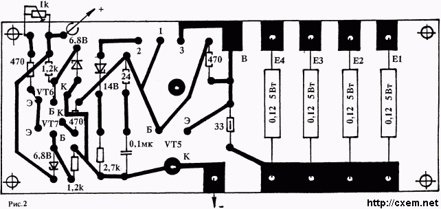 Вторичная обмотка трансформатора должна быть рассчитана на ток 20 А и напряжение 20 В. Диоды моста устанавливаются на радиаторах, лучше использовать силовые диоды с барьером Шоттки. Диоды должны быть на рабочее напряжение не ниже 50 вольт и рабочий ток не менее 20 ампер. Стабилизатор с защитой от замыканий выполнен на транзисторах VT1... VT7. Выходное напряжение устанавливается подстроечным резистором 1ком. Усилитель сигнала ошибки выполнен на дифференциальном каскаде VT6, VT7. Повторитель на составном транзисторе VT5 управляет регулирующими транзисторами VT1...VT4, в эмиттерные цепи которых включены выравнивающие резисторы 0,12 Ом, обеспечивающие равномерное распределение тока по всем четырем транзисторам (по 5 А на каждый). Печатная плата устройства показана на рис.2. Сетевой выпрямитель, фильтрующие конденсаторы и транзисторы VT1...VT4 установлены вне платы. Коллекторы VT1...VT4 гальванически соединены с корпусом, что позволяет использовать шасси в качестве радиатора без изолирующих прокладок.