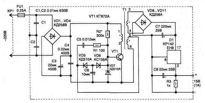 Данный источник может применяться для питания любой нагрузки мощностью до 15...20 Вт и имеет меньшие габариты, чем аналогичный, но с понижающим трансформатором, работающим на частоте 50 Гц. Источник питания выполняется по схеме однотактного импульсного высокочастотного преобразователя, рис. 5.1. На транзисторе собран автогенератор, работающий на частоте 20...40 кГц (зависит от настройки). Частота настраивается емкостью С5. Элементы VD5, VD6 и С6 образуют цепь запуска автогенератора. Во вторичной цепи после мостового выпрямителя стоит обычный линейный стабилизатор на микросхеме, что позволяет иметь на выходе фиксированное напряжение, независимо от изменения на входе сетевого (187...242 В). В схеме применены конденсаторы: С1, С2 типа К73-16 на 630 В; СЗ — К50-29 на 440 В; С4 — К73-17В на 400 В; С5 — К10-17; С6 — К53-4А на 16 В; С7 и С8 типа К53-18 на 20 В. Резисторы могут быть любыми. Стабилитрон VD6 можно заменить на КС147А. Импульсный трансформатор Т1 выполняется на ферритовом сердечнике М2500НМС-2 или М2000НМ9 типоразмера Ш5х5 (сечение магнитопровода в месте расположения катушки 5х5 мм с зазором в центре). Намотка сделана проводом марки ПЭЛ-2. Обмотка 1-2 содержит 600 витков провода диаметром 0,1 мм; 3-4 — 44 витка диаметром 0,25 мм; 5-6 — 10 витков тем же проводом, что и первичная обмотка. Рис. 5.1. Электрическая схема импульсного блока питания на 15 Вт В случае необходимости вторичных обмоток может быть несколько (на схеме показана только одна), а для работы автогенератора необходимо соблюдать полярность подключения фазы обмотки 5-6 в соответствии со схемой. Настройка преобразователя заключается в получении устойчивого возбуждения автогенератора при изменении входного напряжения от 187 до 242 В. Элементы, требующие подбора, отмечены звездочкой "*". Резистор R2 может иметь номинал 150...300 кОм, а конденсатор С5 — 6800...15000 пФ. Для уменьшения габаритов преобразователя в случае меньшей снимаемой во вторичной цепи мощности номиналы электролитических фильтрующих конденсаторов (СЗ, С7 и С8) можно уменьшить. Их величина связана с мощностью нагрузки соотношением: Р — мощность в цепи нагрузки, Вт; Um — амплитудное значение выпрямленного напряжения (для действую щего на входе сетевого напряжения 242 В амплитуда составляет 342 В); Fc — частота сети, для расчета СЗ она берется 50 Гц; DU — максимальный размах пульсации выпрямленного напряжения, допустимый для применяемого типа конденсатора (берется из справочника: так для К50-29 он составляет 10...14%, [Л16], т. е. 34 В). Конструкция корпуса устройства должна предусматривать установку транзистора и стабилизатора D1 на радиаторы, а также экранирование всей схемы для снижения уровня излучаемых помех.