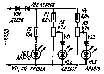 При питании некоторой радиоаппаратуры от сети переменного тока нужно следить за стабильностью ее напряжения и при отклонении напряжения сверх допустимой нормы либо отключать аппаратуру, либо изменять напряжение на ней, например, с помощью автотрансформатора. Для сигнализации отклонений сетевого напряжения можно использовать предлагаемый индикатор (см. рис.), выполненный на трех светодиодах и двух динисторах. Особенностью устройства является включение индикаторов (светодиодов) при каждом положительном полупериоде сетевого напряжения, но лишь при определенной амплитуде его, равной порогу срабатывания, и выключение при снижении мгновенного значения напряжения до нуля. Это исключает гистерезис и повышает точность индикации.