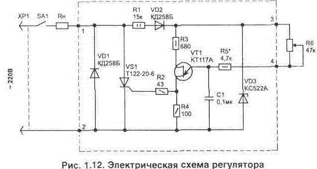 При эксплуатации сетевого паяльника, осветительной лампы, электронагревателей и ряда других потребителей энергии, удобно иметь возможность управлять поступающей на них мощностью. Для таких устройств, как правило, не требуется иметь регулировку подаваемого напряжения от нуля. Ведь паять холодным паяльником невозможно, а у осветительной лампы при малом напряжении отчетливо заметен мерцающий эффект, что утомляет зрение. На рис. 1.12 приведена схема простого электронного регулятора, работающего на одной полуволне сетевого напряжения. -а счет этого она обеспечивает регулировку напряжения в диапазоне 110...215 В. Если тиристор VS1 полностью закрыт, в нагрузку через диод VD1 будет проходить только один полупериод сетевого напряжения. Для открывания тиристора на его управляющий электрод поступают короткие импульсы. Их вырабатывает автогенератор, собранный на однопереходном транзисторе VT1. Частота импульсов такого генератора синхронизирована с частотой сети за счет пульсирующего напряжения питания на VT1. А сами импульсы имеют фазовый сдвиг относительно момента времени перехода сетевого напряжения через "0". Величина сдвига зависит от номиналов конденсатора С1 и резисторов R5-R6. Регулируя R6, можно менять момент открывания тиристора, а значит и действующее выходное напряжение в нагрузке (форма напряжения для активной нагрузки значения не имеет).