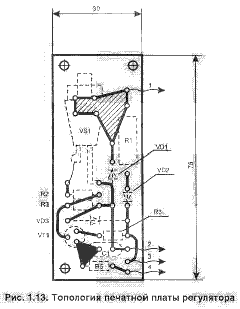 При настройке схемы может потребоваться подбор резистора R5 с таким расчетом, чтобы при нулевом сопротивлении R6 в нагрузку поступало максимальное напряжение. В схеме применены детали: резисторы типа МЛТ или аналогичные (их мощность указана на схеме); конденсатор С1 типа К10-17. Диод VD1 заменяется любым на ток не менее 3...5 А, например КД257Б; VD2 - на ток до 100 мА. Тиристор VS1 можно использовать Т122-25-6 или Т112-10-6, Т112-16-6. Максимальная мощность подключенной нагрузки к регулятору определяется допустимым током через диод VD1 и тиристор VS1 (их лучше выбирать с двойным запасом по току). Для схемы с указанными на ней элементами мощность нагрузки Рнагр=500 Вт (в этом случае теплоотвод для силового коммутатора VS1 не нужен). При установке диода VD1 на больший ток мощность нагрузки можно увеличить до 2 кВт. Для монтажа элементов схемы приведена топология печатной платы, рис. 1.13.