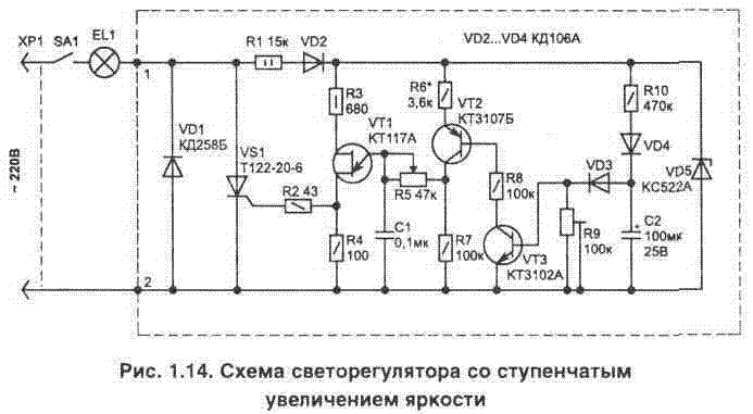 Схема, показанная на рис. 1.14, работает аналогично описанной выше, но при включении, когда регулятор R5 установлен в положение на максимальное выходное напряжение, за счет применения дополнительных элементов VT2, VT3 и С2 обеспечивает ступенчатое увеличение яркости в течении 1...2 с. Процесс прогрева нити накала лампы инерционен и увеличение его времени снижает импульсную перегрузку.