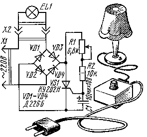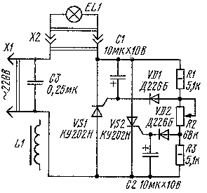 ![]() В регуляторе - маломощный тринистор и такой же выпрямительный диод, включенные встречно- параллельно и установленные в разрыв одного из питающих проводов паяльника. При положительном полупериоде напряжения на верхнем по схеме штыре вилки X1 ток проходит через диод VD1 и нагрузку (паяльник), включенную в розетку X2. При отрицательном полупериоде напряжения на указанном штыре диод закрыт и тока через нагрузку нет. Если бы отсутствовала цепь из тринистора VS1, конденсатора С1 и резисторов R1 - R4, на нагрузке выделялась бы мощность вдвое меньше той, которая была бы при непосредственном питании от сети. Благодаря же использованию тринистора с дополнительными деталями появляется возможность шунтировать диод, когда он закрыт, и пропускать через нагрузку дополнительный ток. Причем этот дополнительный ток можно регулировать переменным резистором R3, изменяя фазу открывания тринистора. В итоге будет изменяться средний ток, протекающий через нагрузку, а значит, выделяющаяся на ней средняя мощность. Если при вставленной в сетевую розетку вилке XI и включенном в гнезда Х2 паяльнике измерить на нем переменное напряжение, то при перемещении движка резистора в крайние положения стрелка вольтметра зафиксирует изменение напряжения примерно от 150 до 210 В. Естественно, включив в гнезда Х2 настольную лампу, можно изменять яркость ее свечения. Как в первом, так и во втором вариантах мощность нагрузки не : должна превышать 30 Вт. Вместо диода Д226Б подойдет другой выпрямительный, рассчитанный на ток не менее 300 мА и обратное напряжение выше 300 В, а вместо тринистора КУ101Б -КУ101Г, КУ101Е. Если применить более мощный диод, например Д245А, и установить тринистор КУ201Д - КУ201Л или КУ202Д - КУ202Н, регулятор можно использовать для управления напряжением на нагрузке мощностью до 400 Вт. Налаживание регулятора сводится к проверке и подбору пределов регулирования напряжения на нагрузке. Включив в гнезда Х2 настольную лампу, измеряют напряжение на ней при крайних положениях движка резистора. Минимальное напряжение (около 150 В) устанавливают подбором резистора R1, максимальное - подбором резистора R4. В заключение полезно изготовить и отградуировать шкалу переменного резистора. В значительно более широких пределах можно изменять напряжение на нагрузке с помощью регулятора, показанного на рис. 2. Нагрузка (настольная лампа) в нем включена в сеть через диодный мост на диодах VD1 - VD4. Диоды включены так, что пока закрыт тринистор VS1, ток через лампу не течет.