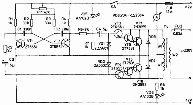 Схема преобразователя постоянного напряжения 12 В в переменное 220 В приведена на рис.1. Этот инвертор подходит для питания потребителей, которым необходимо переменное напряжение 220 В с общей мощностью до 100 Вт.