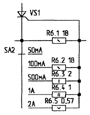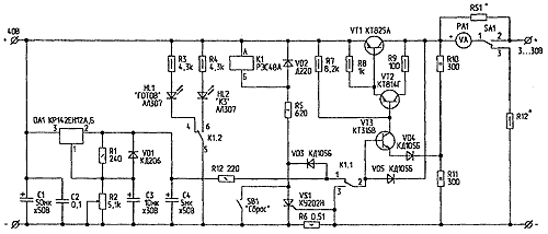 Рис.4. Ступенчатая система защиты Указанные на схеме сопротивления резисторов — ориентировочные. Точнее их можно рассчитать, лишь зная напряжение открывания тиристора, работающего в стабилизаторе. Измерить это напряжение можно так. Движок переменного резистора R2 установите в крайнее нижнее (по схеме) положение и подключите к нему управляющий электрод тиристора, отпаяв его от правого (по схеме) вывода резистора R6.1. Затем включите питание и медленно увеличивайте резистором R2 напряжение на управляющем электроде тиристора. В момент открывания тиристора, о чем просигнализирует светодиод, измерьте вольтметром это напряжение. Резисторы R6.2...R6.5 монтируются непосредственно на контактах переключателя SA2. Резисторы RS1 и R12 подбираются конкретно под имеющийся измерительный прибор. Источники