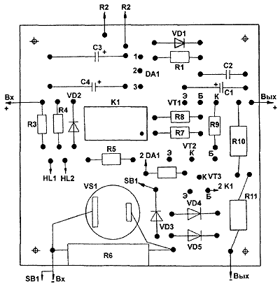 Рис.3. Печатная плата - сторона монтажа Тиристор КУ202К заменяется на КУ201В...КУ201Л, КУ202В...КУ202Н. Вместо диода Д220А (VD2) подойдут Д219, Д220, Д223, КД102, КД103 с любыми буквенными индексами, а вместо диода КД105Б (VD3, VD4, VD5) — КД106А или любой другой кремниевый с прямым током до 300 мА и обратным напряжением не менее 50 В. Переменный резистор R2 — любого типа с характеристикой А. Реле К1 — РЭС48А (паспорт РС4.590.206) или другое с двумя группами переключающих контактов, срабатывающее при напряжении не более 30 В. Резистор R6 выполнен в виде нескольких витков константанового, нихромового или манганинового провода, намотанного на корпус резистора МЛТ-1. Его сопротивление определяется значением тока срабатывания, что, в свою очередь, зависит от напряжения на управляющем электроде тиристора, при котором он открывается. Так, например, если за максимальный ток срабатывания защиты принять 2 А, а тиристор открывается при напряжении на управляющем электроде около 1 В, сопротивление резистора R6 должно быть (по закону Ома) близко к 0,5 Ом. Возможно применение резисторов типа С5-16 соответствующей мощности. Более точно сопротивление резистора подгоняют под выбранный предел срабатывания защиты в таком порядке. К выходу стабилизатора подключают соединенные последовательно амперметр и проволочный переменный резистор сопротивлением 25...30 Ом. На вход стабилизатора подают соответствующее напряжение от выпрямителя, и резистором R2 устанавливают на выходе напряжение 10...15 В. Затем переменным резистором, выполняющим функцию эквивалента нагрузки, устанавливают по амперметру ток, равный 2 А, и подбором сопротивления резистора R6 добиваются срабатывания системы защиты. В радиолюбительской практике нередки обстоятельства когда от перегрузки токами меньшего значения, например, 50 или 100 мА, защищать приходится не только сам стабилизатор напряжения, но и питающееся от него устройство. При этом желательно иметь ступенчатую систему защиты, выполненную, например, по схеме, приведенной на рис.4. Здесь резистор R6.1 первой ступени, рассчитанный на минимальный ток защиты 50 мА, включен в стабилизатор постоянно, а параллельно ему переключателем SA2 подключают резисторы R6.2...R6.5 четырех других ступеней: 100 мА, 500 мА, 1 А и 2 А.