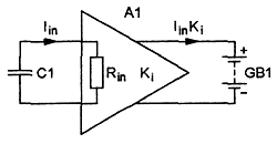 Конденсатор емкостью С1, предварительно заряженный до напряжения U0, разряжается через усилитель тока А1 с входным сопротивлением Rin и коэффициентом усиления по току Кi. Ток во входной цепи усилителя Iin определяется выражением