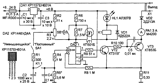Рис.3. Принципиальная схема устройства В режиме "Уменьшающийся" (контакты выключателя SA1 разомкнуты) конденсатор С2 емкостью 1000 мкФ разряжается через резистор R5 с постоянной времени, выбранной по формуле (3). Экспоненциально уменьшающийся ток через этот конденсатор усиливается ОУ DA2.1 и транзисторами VT2, VT3 и заряжает аккумуляторы, подключенные к разъему Х1 ("Выход"). Диод VD2 предотвращает их разрядку при отключении напряжения питания. Амперметр РА1 служит для контроля текущего значения тока зарядки. Конденсатор С5 предотвращает самовозбуждение устройства. Резисторы R4, R8-R10 - токоограничительные. Они защищают ОУ и транзистор VT2 в аварийных ситуациях, например, при обрыве резистора R11 или пробое транзистора VT3, предотвращая выход из строя остальных элементов. При отключении питания в режиме зарядки уменьшающимся током транзистор VT1 закрывается и реле размыкает контакты К1.1, предотвращая дальнейшую разрядку конденсатора С2. Светодиод HL1 гаснет, сигнализируя об отключении питания. С восстановлением питания транзистор VT1 открывается, реле К1 замыкает контакты К 1.1 и зарядка аккумуляторов автоматически продолжается с того значения тока, при котором он был прерван. Светодиод HL1 снова загорается, сигнализируя о возобновлении зарядки. Нажатием на кнопку SB1 можно кратковременно прекратить зарядку при снятии зарядных характеристик. При этом конденсатор С4 предотвращает проникание сетевых наводок на вход ОУ. Устройство собрано на универсальной печатной плате и размещено в корпусе размерами 310x130x180 мм. Аккумуляторы типоразмера АА размещают в желобе на верхней крышке корпуса. Контактные гнезда выполнены в виде отрезков ленты из луженой жести, которые прижимаются к аккумуляторам пружиной от стандартного отсека для элемента типоразмера АА. Через пружину ток не идет. Следует отметить, что имеющиеся в продаже пластмассовые отсеки пригодны лишь при токе, не превышающем 500 мА. Дело в том, что ток, протекающий через контактные пружины, разогревает их, при этом нагреваются и аккумуляторы. Уже при токе 1 А пружины нагреваются настолько, что расплавляют стенку пластмассового корпуса отсека, делая его дальнейшее использование невозможным. Транзистор VT3 установлен на ребристом теплоотводе с площадью поверхности 600 см2, диод VD2 - на пластинчатом теплоотводе площадью 50 см2. Резистор R11 составлен из трех соединенных параллельно резисторов МЛТ-1 сопротивлением 1 Ом. Все сильноточные соединения выполнены отрезками медного провода сечением 3 мм2, которые припаяны непосредственно к выводам соответствующих деталей. ОУ К1446УД4А (DA2) можно заменить микросхемой К1446УД1А или другой из этих серий, но из двух ОУ нужно выбрать тот, у которого напряжение смещения меньше. Второй ОУ может быть использован в составе термочувствительного моста [8] для аварийного отключения аккумуляторов при их перегреве во время зарядки постоянным током (при зарядке уменьшающимся током перегрев аккумуляторов не наблюдался). В случае использования ОУ других типов следует иметь в виду, что в данной конструкции питание его однополярное, поэтому он должен быть работоспособен при нулевом напряжении на обоих входах. Микросхема КР1157ЕН601А (DA1) заменима стабилизатором этой серии с индексом Б, а также микросхемой серии К1157ЕН602, однако у последней иная "цоколевка" [9]. Транзистор VT1 - любой из серии КП501,