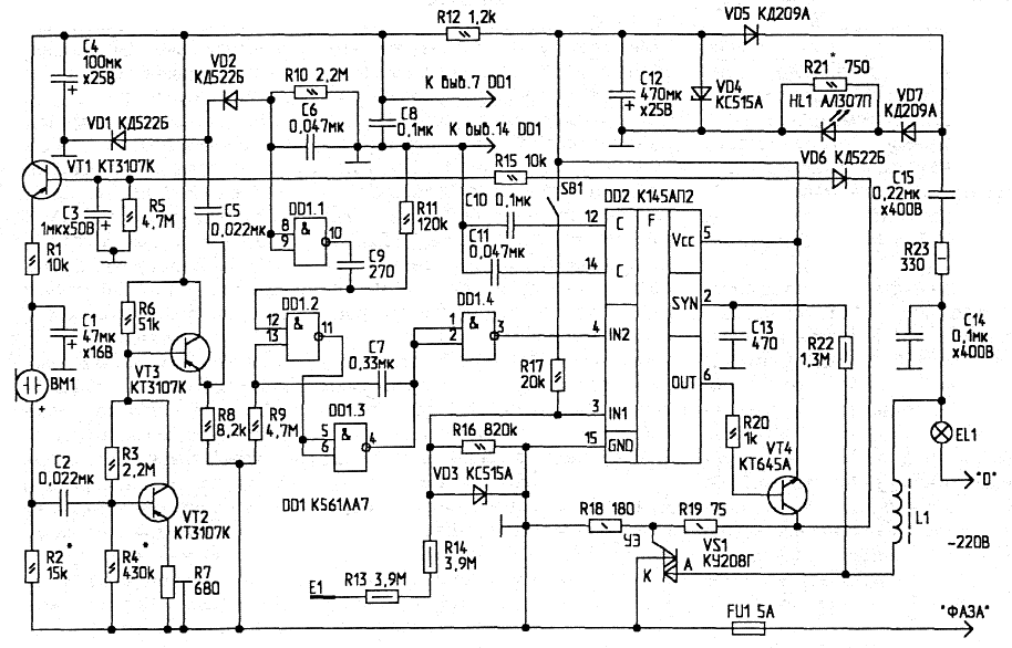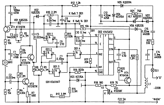 Рис.1. Принципиальная схема регулятора мощности Кроме сенсора, для управления можно воспользоваться кнопкой SB1. При ее нажатии все процессы протекают аналогично. Преимущество кнопочного управления перед сенсорным заключается в том, что не требуется соблюдать фазировку при подключении регулятора к сети. Если же применить кнопку с фиксацией положения, то при ее замыкании лампа будет непрерывно изменять свою яркость, что может оказаться полезным, например, для управления елочной гирляндой. Кроме того, регулятор мощности оснащен звуковым реле, которое позволяет дистанционно выключить подключенные к нему лампы накаливания. С помощью звукового реле можно и включить лампы, но только если время после их отключения не превысит 5...10 с. Такая блокировка на включение предусмотрена для того, чтобы не произошло случайного включения ламп в отсутствие хозяев. Звуковое реле реагирует только на резкие громкие звуки, например, хлопок ладонями, и не чувствительно к шагам, раскатам грома при грозе, громко работающему телевизору. Микросхема К145АП2 имеет два входа - IN1, IN2 (выводы 3, 4), которые по отношению друг к другу являются инверсными. Вход IN1 управляется высоким логическим уровнем, вход IN2 - низким. Стабилитрон VD3 защищает вход IN1 от высокого напряжения при касании сенсора. На вывод 2 DD2 поступают импульсы переменного напряжения для синхронизации работы микросхемы с частотой сети. Конденсатор С11 предназначен для работы системы ФАПЧ. Транзистор VT4 усиливает выходной ток микросхемы. Дроссель L1 и конденсатор С14 уменьшают проникающие в сеть импульсные помехи, возникающие при открывании симистора. На работе звукового реле остановлюсь более детально. С его помощью можно только выключить или включить EL1. Регулирование мощности звуковым реле не предусмотрено. Сигнал с электретного микрофона ВМ1 усиливается каскадом на транзисторах VT2, VT3 и детектируется выпрямителем на диодах VD1, VD2. Выпрямленное напряжение подается на инвертор DD1.1. Когда уровень звукового сигнала небольшой, на входах 8, 9 DD1.1 - логический "О", на выводе 10 - логическая "1". Когда напряжение на входах DD1.1 достигнет уровня "1", на выходе DD1.1 будет "О", но в работе регулятора ничего, вроде бы, не изменится. Однако как только на входах DD1.1 снова будет логический "О", на вывод 12 DD1.2 через С9 поступит короткий импульс, который запустит ждущий мультивибратор на DD1.2, DD1.3. Мультивибратор сформирует единичный импульс, длительность которого задана элементами R9, С7 и достаточна для управления микросхемой DD2 при подаче управляющего напряжения на вход IN2. Чтобы предотвратить ошибочное включение EL1 звуковым реле, питание на микрофон подается через ключ на транзисторе VT1. Ключ управляется напряжением, снимаемым с коллектора VT4. При отключенной нагрузке, транзистор VT4 постоянно закрыт, короткие импульсы напряжения для заряда конденсатора СЗ не поступают, поэтому VT1 также закрыт, и микрофон ВМ1 обесточен. Время, в течение которого еще можно включить нагрузку звуковым реле после ее отключения, в основном, зависит от емкости конденсатора СЗ. Рекомендуемое ее значение - 1...10 мкФ. Логическая часть устройства питается напряжением -15 В от параметрического стабилизатора на VD4, VD5, VD7, HL1, С15 и R23. Светодиод HL1 предназначен для подсветки сенсора Е1 в темноте. Емкости конденсатора С12 достаточно, чтобы регулятор продолжил свою работу