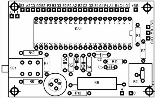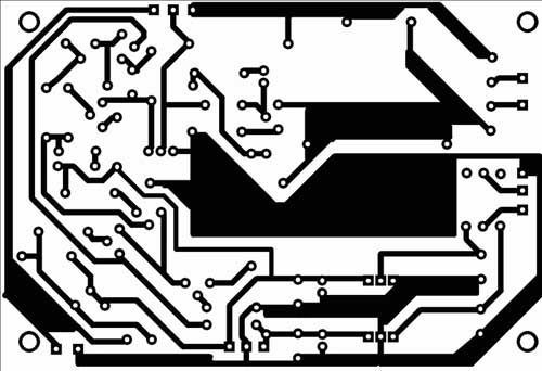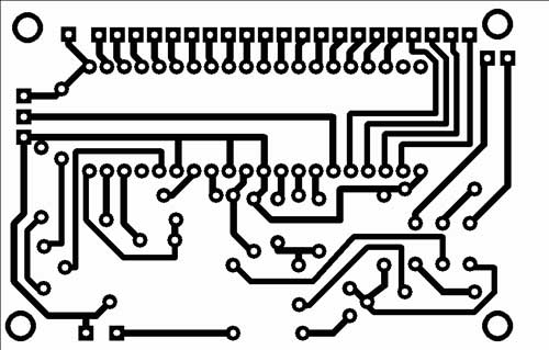 Цифровая панель индикации напряжения и тока. После включения питания и безошибочном монтаже, при исправных деталях должны засветиться сегменты индикации HG 1- HG 3. По вольтметру резистором R 2 на ножке 36 микросхемы КР572ПВ2 выставляется напряжение 1 вольт. К ножкам (а) и ( b ) подключают блок питания. На выходе блока питания устанавливают напряжение 5 … 15 вольт и подбирают резистор R 10 (грубо), заменив его, на время, переменным. С помощью резистора R8 устанавливают более точное показание напряжения. После чего, к выходу блока питания подсоединяют переменный резистор мощностью 10 … 30 ватт, по амперметру выставляют ток равным 1А и резистором R 6 выставляют значение на индикаторе. Показание должно быть 1,00. При токе 500 мА – 0,50, при токе 50мА – 0,05. Таким образом, индикатор может индицировать ток от 10мА, т.е. 0,01. Максимальное значение индикации тока 9,99А. Для большей разрядности индикации можно применить схему на КР572ПВ6. Размер печатной платы цифровой панели 80 х 50 мм ., рис.6 и рис.7. Контактные площадки U и I на печатной плате цифровой панели, с помощью гибких проводников подключаются к точкам соответствующих индикаторов HG 2 и HG 1. Микросхему КР572ПВ2А можно заменить на импортную микросхему ICL7107CPL.