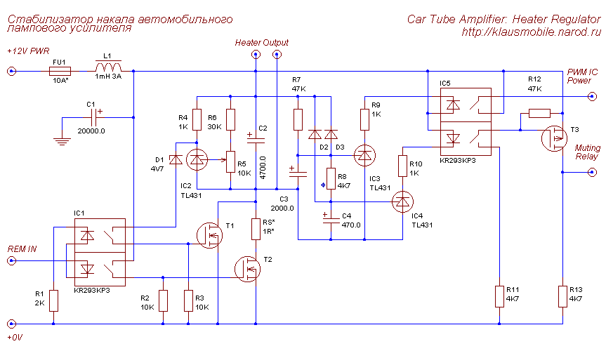 2. Накальный ключ-стабилизатор и таймеры Изюминка ключ-стабилизатора - в двух проходных транзисторах, которые в двух наиболее типичных режимах бортсети (11.5-12.0В на стоянке, 14.0-14.5В в движении) работают с минимальным тепловыделением. В движении открыт Т2, Т1 закрыт, излишек напряжения падает на R5. Сопротивление R5+Rcи(Т2) равно 3В/Iнагрузки. На стоянке оба транзистора открыты, ток течет через Т1, на котором рассеивается P=Iнагрузки*Rcи (порядка десятков миллиВатт). Т1 должны иметь стандартные, а не "логические" уровни Uзи. Rси Т2 некритично, Т1 - не более 100 мОм (из расчета 300мВ потерь при 3А токе нагрузки). Если задача тепловой разгрузки Т1, Т2 не стоит (есть достойный радиатор), то можно поставить Т2 с Rcи=1 Ом (для тока 3А) и совсем исключить R5. Я поставил IRFI540, без радиатора (охлаждение T1 обеспечивается за счет большой площади дорожек стока и истока. Анодный таймер использует в качестве проходного элемента оптрон, таймер реле - P-МДП транзистор, или PNP-транзистор (КТ837, потребуется уменьшить резисторы R12-R13), управляемый оптроном. При снятии сигнала REM IN все емкости, расположенные после ключа Т1Т2, быстро разряжаются на нити накала ламп, гарантируя установление таймера в состояние "выключено" даже при кратковременных выпадениях REM IN.