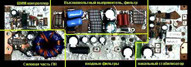 Трансформатор - на кольце М1500 38*24*14, обточенном до эллиптического сечения. Сначала выполнена вторичная обмотка (140 витков = 2 слоя литцендрата неизвестной мне марки, около 0.2 кв.мм. суммарным сечением), затем первичная (2*4.5 витков, коса 7 жил ПЭВ 0.75мм). Выпрямитель - мост Греца, чтоб обойтись одной вторичной обмоткой. Снабберы установлены и в первичной, и во вторичной цепи. Во вторичной цепи роль снаббера выполняет просто резистор на входе диодного моста, без емкостей (они тут потребовались бы очень малые). Фильтр CRCRC (СRCR на плате ПН, последний С, красная рамка - на плате УНЧ). Первый С в цепи - К73-17 на 630В, далее электролиты. Дроссель я не поставил, так как и резистора достаточно, да и лишняя амплитуда переменки на дросселе тут ни к чему. Цепь ОС снимает выходной уровень со второго конденсатора фильтра. При этом петля получается абсолютно устойчивой (нагрузка 0-300мА, выходное напряжение 150-300В). Цепь датчика ОС намеренно выполнена относительно низкоомной - она обеспечивает нагрузку фильтра на холостом ходу и разряд емкостей при выключении. В районе точки стабилизации (ток светодиода оптрона 1.5 .. 3 мА) ток потребления разрядной цепи возрастает с примерно 4 до 8 мА - своего рода стабилизирующий шунт, работающий параллельно с петлей ОС ШИМ. Для устойчивости ОС коэффициент усиления усилителя ошибки выбран относительно небольшим (примерно 15). Для проверки эффективности стабилизации пользуюсь простой активной нагрузкой: