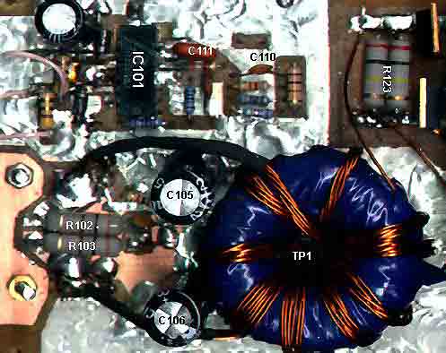 Плата двусторонняя, 260*80мм (фактически, компоненты занимают 250*60мм). Анодные цепи разведены только на верхней стороне платы без переходных отверстий (поверхностный монтаж). Т1, Т101, Т102, расположены под платой (касаются дна шасси, которое и есть радиатор. Суммарный теплоотвод не более 7-10Вт). Стоки Т101, Т102 распаяны на верхней стороне платы на контактные площадки примерно 8*15мм, к которым сверху припаяны выводы первички и R102, 103. Истоки Т101, 102 и минусовые ного С105, 106 распаяны на верхний слой земли. С105, 106 зашунтированы чип-конденсаторами 1мкФ (SMD 1206), распаянными между выводами С105, 106 непосредственно у их основания. Аналогично, блокировочные конденсаторы у выводов 8,11,15,16 IC101 распаяны с нижней и верхней стороны платы. С111 должен быть достаточно термостабильным.