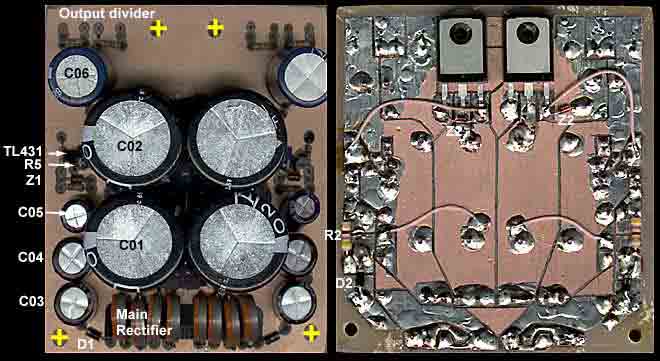 В реальной схеме номиналы изменены: C03, C04 1000мкФ 35В, С05 2200 мкФ 25В, R2 1kOm 1Вт. Заземляться может как выход 0V, так и +12V, и средняя точка накальных нитей, и вывод (не силовой!) +6V. Как с шумами в схеме карты лягут, так и заземлять. Диоды главного моста - КД213, диоды умножителя - любые 100В, 1А минимум. Кстати - IRFP150 на фото не родные IR, а Наrris - отличить легко, у IR контактная железяка отполирована до блеска. Ну и ладно, не блестят но работают.