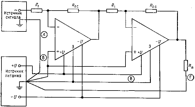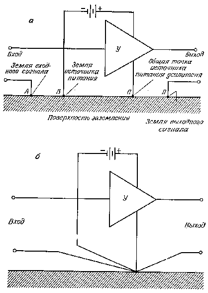 НаводкиТак как наводки представляют собой источник нежелательных сигналов, то они могут быть причислены к шумам. Защита от наводок может быть достигнута за счет надлежащего заземления, тщательного расположения монтажа и экранирования. Задача надлежащего экранирования может оказаться достаточно сложной, но может быть сведена к трем простым принципам (которым отнюдь не просто следовать): 1) проводник экрана должен быть присоединен к нулю опорного напряжения сигнала (земле сигнала) только один раз (При экранировании низкочастотных помех в ближнем поле. При экранировании радиопомех заземление лучше подобрать экспериментально); 2) экран и земля сигнала должны быть заземлены у источника питания в одной и той же физической точке; 3) все проводники, несущие сигнал, должны быть помещены в экран. Надлежащий монтаж должен исключать чрезмерную сгущенность, длинные пути прохождения сигнала с экраном или без него, не необходимые перекрещивания проводов. Другими словами, следуйте хорошему конструкторскому опыту.ЗаземлениеНепродуманное заземление, как правило, приводит к восприятию схемой нежелательных сигналов. Сформулировать принцип надлежащего заземления нетрудно, но иногда следовать этому принципу тяжело. Этот принцип можно сформулировать так: заземление, по которому течет ток нагрузки к источнику питания, должно осуществляться отдельным проводом, а не объединяться с проводом земли сигнала. На рис. 1 показан пример реализации этого принципа. Смысл такого заземления заключается в том, что часто ток нагрузки во много раз больше тока сигнала. Ток нагрузки, протекая даже через провода достаточно большого сечения, может вызвать падение напряжения (IR) на линии заземления. Это вызовет изменение напряжения на линиях опорного напряжения каждого ОУ, присоединенного к этой линии заземления. В экстремальных случаях это изменение потенциала может составить несколько милливольт и может служить источником значительной погрешности.
