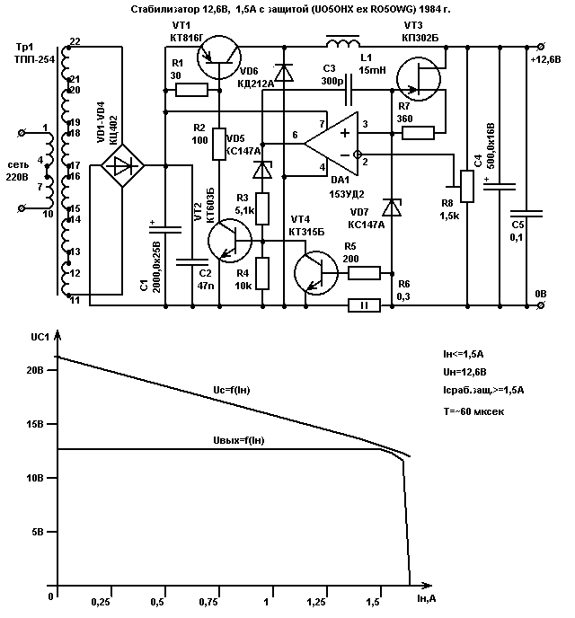 Этот стабилизатор предназначался для питания магнитофона “Весна-205”. При тестировании практически все превышение напряжения на входе испольэовалось для поддержания выходного напряжения равным заданному. Величина тока защиты полностью определяется номиналом сопротивления R6. Источник (автор):www.shustikov.by.ru