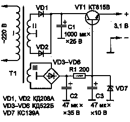В статье описывается простая конструкция трансформаторного блока питания для наиболее распространенных трехвольтных аудиоплейеров и диктофонов фирм Sony, Panasonic, Sharp, Philips и др. Его особенность - повышенная надежность в аварийных ситуациях: он спасет себя и нагрузку от чрезмерного тока, не имея специального узла защиты. Читателям наверняка знакома такая аварийная ситуация: вы решили послушать перед сном любимую мелодию, но кассета оказалась неперемотанной. Включаете перемотку и ... засыпаете. Кассета остановилась, а двигатель продолжает работать в тяжелом режиме. При этом интенсивно изнашиваются детали лентопротяжного механизма. Если аудиоплейер питался от гальванических элементов, их хватит максимум на час. А если - от блока питания, способного поддерживать неизменным выходное напряжение независимо от тока нагрузки (за исключением случая короткого замыкания в ней)? Как показывает практика, это зачастую приводит к выходу из строя электронного регулятора скорости вращения электродвигателя, что уже серьезно. Предлагаемый блок питания - не универсальный. Он предназначен только для аудиоплейера или диктофона. В аварийной ситуации, описанной в начале статьи (заторможенный режим перемотки), такой источник питания резко уменьшит напряжение на выходе. Этого вполне достаточно, чтобы спасти плейер в нестандартных условиях работы, не применяя специальных электронных устройств, а значит, и без дополнительных материальных затрат.