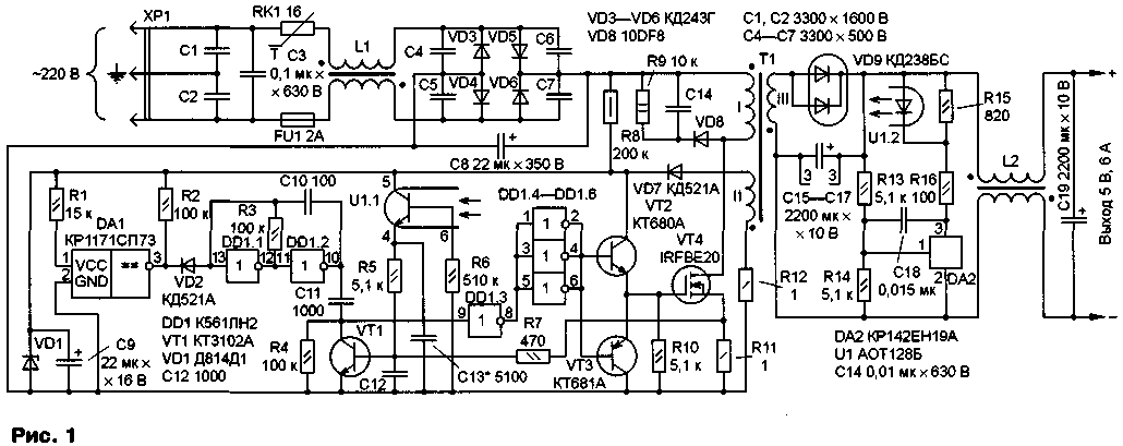 А. МИРОНОВ, г. Люберцы Московской обл. В предлагаемой вниманию читателей статье описан импульсный преобразователь для питания электронных устройств напряжением 5 В от сети переменного тока. Преобразователь не содержит дефицитных и дорогих элементов, прост в изготовлении и налаживании. Источник питания снабжен защитой от бросков выходного напряжения и от перегрузки по току с автоматическим возвратом в рабочий режим после ее устранения. Основные технические параметры Входное напряжение, В .....150...240 Частота входного напряжения, Гц...................50...60 Частота преобразования, кГц.........................100 Выходное напряжение, В .........5 Амплитуда пульсаций выходного напряжения, мВ, не более.....................50 Ток нагрузки, А................0...6 Температура окружающей среды, °С ..............-10...+50 Статическая нестабильность выходного напряжения при изменении входного напряжения, тока нагрузки и температуры окружающей среды в полном интервале,%, от номинального значения, не более.........3 Габариты, мм .............60x95x30 На рис. 1 показана схема устройства. Узел управления реализует широтно-импульсный принцип стабилизации выходного напряжения. На элементах DD1.1, DD1.2 выполнен задающий генератор, работающий на частоте около 100 кГц при скважности, близкой к двум. Импульсы длительностью около 5 мкс через конденсатор С11 поступают на вход элемента DD1.3, а затем усиливаются по току включенными параллельно элементами DD1.4—DD1.6. Чтобы стабилизировать выходное напряжение источника питания, длительность импульса во время регулирования уменьшается. "Укорачивает" импульсы транзистор VT1. Открываясь каждый период работы генератора, он принудительно устанавливает на входе элемента DD1.3 низкий уровень. Это состояние удерживается до конца очередного периода разряженным конденсатором С11.