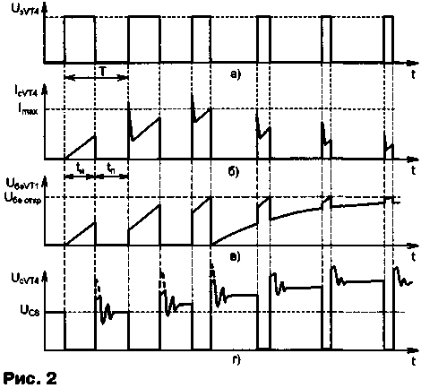 На транзисторах VT2, VT3 выполнен мощный усилитель тока, обеспечивающий форсированное переключение коммутирующего транзистора VT4. Диаграммы напряжения на основных элементах источника питания во время его запуска показаны на рис. 2. Когда транзистор VT4 открыт, ток, протекающий через него и обмотку I трансформатора Т1, линейно нарастает (рис. 2,6). Импульсное напряжение с датчика тока R11 через резистор R7 подается на базу транзистора VT1. Чтобы исключить ложное открывание транзистора, выбросы тока сглаживает конденсатор С12. Первые после запуска несколько периодов мгновенное напряжение на базе транзистора VT1 остается меньше напряжения открывания U6э откр * 0,7 В (рис. 2, в). Как только мгновенное напряжение во время очередного периода достигнет порога 0,7 В, транзистор VT1 откроется, что, в свою очередь, приведет к закрыванию коммутирующего транзистора VT4. Таким образом, ток в обмотке I, а значит, и в нагрузке не может превышать некоторого значения, заранее определенного сопротивлением резистора R11. Этим обеспечивается защита источника питания от перегрузки по току. Фазировка обмоток трансформатора Т1 установлена такой, что во время открытого состояния транзистора VT4 диоды VD7 и VD9 закрыты обратным напряжением. Когда коммутирующий транзистор закроется, напряжение на всех обмотках меняет знак и увеличивается до тех пор, пока эти диоды не откроются. Тогда энергия, накопленная во время импульса в магнитном поле трансформатора Т1, направляется на зарядку конденсаторов выходного фильтра С15—С17 и конденсатора С9. Заметим, что, поскольку фазировка обмоток II и III совпадает, напряжение на конденсаторе С9 в режиме стабилизации выходного напряжения также стабилизировано независимо от значения входного напряжения источника питания. Регулирующий элемент источника питания — микросхема DA2 КР142ЕН19А. Когда напряжение на управляющем выводе 1 микросхемы достигнет 2,5 В, через нее и через излучающий диод оптрона начинает протекать ток, увеличивающийся с ростом выходного напряжения. Фототранзистор оптрона открывается, и ток, протекающий через резисторы R5, R7 и R11, создает на них падение напряжения, также увеличивающееся с ростом выходного напряжения. Мгновенное напряжение на базе транзистора VT1, равное сумме падения напряжения на резисторе R7 и датчике тока R11, не может превышать 0,7 В. Поэтому при увеличении тока фототранзистора оптрона увеличивается постоянное напряжение на резисторе R7 и уменьшается амплитуда импульсной составляющей на резисторе R11, что, в свою очередь, происходит только из-за уменьшения длительности открытого состояния коммутирующего транзистора VT4. Если же длительность импульса уменьшается, то сокращается и "порция" энергии, перекачиваемая каждый период трансформатором Т1 в нагрузку.