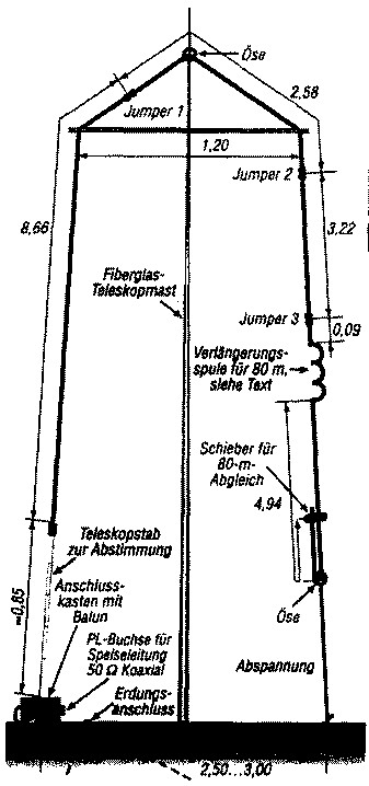 Вертикальнуая антенна SQ-Vertical (Super Quick Vertical) конструкции DK9SQ может работать на всех диапазонах от 80 до 10 метров. На каждом диапазоне она представляет собой четвертьволновый излучатель с системой противовесов. При этом общая длина излучателя для 80-метрового диапазона составляет около 19 метров. Проволочный излучатель растянут с помощью 9-метровой фибергласовой мачты и горизонтальной распорки длиной 1,2 м, как показано на рис.1.