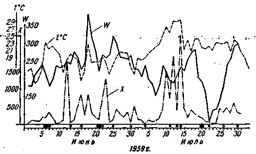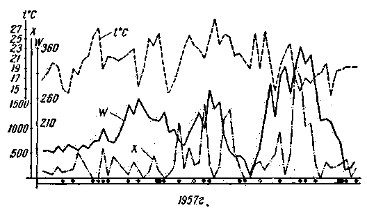 Ниже публикуется статья В. Жаркова, принимающего Лондонскую телевизионную станцию во Львове. Этот прием он связывает с хромосферными вспышками солнца, которые, по его мнению, образуют спорадический слой, и делает вывод, что этот прием возможен во время высокой активности солнца. Однако измерения слоя Еs показывают, что не только нет прямой корреляции (совпадение, согласованность) между слоем Es и активностью солнца, а в прошлом цикле солнечной активности была слабая обратная корреляция. С 1957 г. по 1961 г. несмотря на то, что активность упала более, чем в два раза, электронная плотность этого слоя остается на одном и том же уровне. Как известно, хромосферные вспышки происходят с марта по сентябрь, в то время как дальний прием телевидения чаще наблюдается с мая по август, в этот же период электронная плотность слоя Еs, наибольшая. В летний сезон хромосферные вспышки, сильно влияющие на ионосферу, бывают редко - не более 2-3 раз в месяц, а высокая электронная плотность слоя Еs наблюдается почти ежедневно. Хромосферные вспышки влияют на ионосферу в основном на освещенном полушарии, прием же дальнего телевидения, хотя и реже, возможен и в вечерние и в ночные часы.. . Удовлетворительного объяснения природы слоя Еs пока не найдено, и предположение т. Жаркова о связи этого слоя с хромосферными вспышками представляет интерес, но требуются дальнейшие наблюдения и сопоставления. Общеизвестно, что сверхдальний прием телевидения обычно происходит в летние месяцы и, главным образом, за счет отражения от ионизированного слоя Еs, структура и происхождение, которого до настоящего времени еще недостаточно выяснены. Обнаружено, что случаи сверхдальнего приема телевизионных передач повторяются через 27 дней. На графиках (рис. 1) приводится сопоставление случаев дальнего приема телевизионных сигналов Лондонской телевизионной станции (частота 45 Мгц) с солнечными данными: числом пятен W и частотой хромосферных вспышек X. Прием сигналов производился на неподвижную антенну, ориентированную на местный телецентр (г. Львов), расположенный примерно в 80 км к югу от пункта наблюдения (г. Сокаль). Таким образом сигналы сверхдальних станций принимались как помехи местной телевизионной передаче.