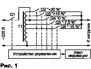 С. КОРЯКОВ, г. Шахты Ростовской обл. Длительное отклонение сетевого напряжения более чем на 10 % от номинального значения 220 В во многих районах нашей страны, к сожалению, стало нередким явлением. При повышенном (до 240...250 В) напряжении в сети значительно сокращается срок службы осветительных приборов, увеличивается нагрев трансформаторных блоков питания и двигателей в компрессорах холодильников. Снижение сетевого напряжения ниже 160... 170 В вызывает значительное увеличение нагрузки на ключевые транзисторы в импульсных блоках питания (это может привести к их перегреву и последующему тепловому пробою), а также заклинивание двигателей в компрессорах холодильников, что тоже приводит к их перегреву и выходу из строя. Еще большие колебания напряжения у однофазных потребителей, питающихся от трехфазной сети, возникают в случае обрыва нулевого провода на участке от точки подключения потребителя к четырехпроводной сети до трансформаторной подстанции. В этом случае вследствие перекоса фаз напряжение в розетке может изменяться от нескольких десятков вольт вплоть до линейного 380 В, что неминуемо приведет к повреждению практически всей сложной бытовой техники, подключенной к розетке. Избежать неприятностей, связанных с экстремальными колебаниями напряжения в сети, поможет предлагаемый стабилизатор. Для стабилизации напряжения сети в бытовых условиях используют в основном феррорезонансные стабилизаторы. К числу их недостатков следует отнести искажение синусоидальной формы выходного напряжения (к примеру, холодильник к такому стабилизатору подключать запрещается), ограниченную мощность стабилизаторов бытового назначения (300...400 Вт) при значительных массогабаритных показателях, невозможность работы без нагрузки, узкий диапазон стабилизации и выход из строя при повышенном напряжении в сети. От указанных недостатков свободен компенсационный стабилизатор напряжения, структурная схема которого показана на рис. 1.