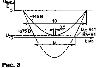 По записанной в памяти программе МК DD1 производит измерение сетевого напряжения в каждом периоде (20 мс). С делителя R1R2 отрицательные полуволны сетевого напряжения, проходя через стабилитрон VD1, формируют на нем импульсы с амплитудой, определяемой напряжением стабилизации стабилитрона, в данном случае 10 В. С делителя R3R4, уменьшающего амплитуду полученного сигнала до ТТЛ уровня (рис. 3), эти импульсы приходят на линию 0 порта А, настроенную на ввод.