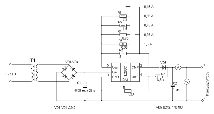 аккумулятор с напряжением 12 вольт и ёмкостью 7,2 ампер-часа. Далее все было просто - берем 10-ти ваттную автомобильную лампочку, вешаем её на длинном проводе на дерево и подключаем к сабжу - свет готов. А для подключение магнитолы ваяем простенький стабилизатор на КРЕН8А или её буржуйском аналоге LM7809, прикручиваем провода к клемам в батарейном отсеке - e voila - имеем свет и музыку. Должен вам сказать, что подобная схема уже испытывалась - хватает на всю ночь непрерывной работы и аккумулятор до конца не разряжается. Но вы же понимаете, что все хорошо до конца не бывает - должна быть где то капелька отходов чловеческого метаболизма, которая должна отравить всю идиллию. В данном случае засада в том, что эти аккумуляторы нельзя заряжать обычными зарядными устройствами для автомобильных аккумуляторов. Обычные кислотно-свинцовые аккумуляторы заряжаются постоянным по величине током, при этом напряжение на клеммах все время растет и когда оно достигает определенной величины - электролит в аккумуляторе закипает, что свидетельствуе об окончании заряда. Давайте себе представим, что будет, когда закипит герметичный аккумулятор. Я так полагаю, что жертв и разрушений вряд ли удасться избежать. Посему эти ящики заряжают по-другому: ток заряда устанавливают равным 0,1С, где С - это ёмкость аккумулятора, причем, зарядный ток ограничивают, поскольку этот товарищ "неудовлетворенный желудочно" и готов сожрать все, что ему дают, напряжение стабилизируют и устанавливают в пределах 14-15 вольт. В процессе заряда напряжение остается практически неизменным, а ток будет уменьшаться от установленного, до 20-30мА в самом конце заряда. То есть, нужно было собрать зарядное устройство. Возиться ужасно не хотелось, но тут выручили буржуи - ST
