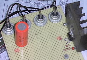 деталюхами Микросхему, разумеется, надо установить на радиатор, причем, тоже не жадничать - все это хозяйство расчитано на долговременную работу, поэтому, чем легче будет тепловой режим элементов, тем лучше для них, а значит и для вас. Резистором R7 подстраивается выходное напряжение в пределах 14-15 вольт. Диоды лучше брать наши, отечественные в металлических корпусах, тогда их не надо устанавливать на радиаторы. Напряжение на вторичной обмотке трансформатора 15-16 вольт. Лично я никакой платы не делал, не так уж много тут деталей - собрал все на макетке. Что получилось видно на фотке. Рис 3.2 Все в