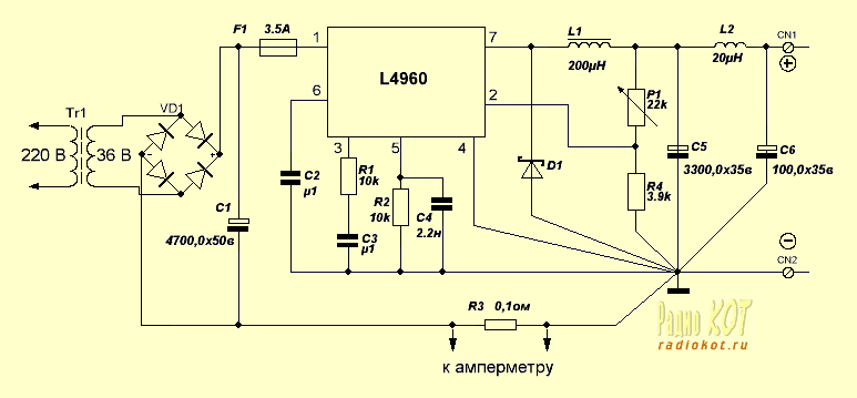 Автор - Сэр Мурр Современная схемотехника и производители микросхем здорово облегчили жизнь конструктору-например,при создании источников питания. Продемонстрируем это на микросхеме L4960.Согласно заводской документации, на ней можно изготовить регулируемый источник питания с выходным напряжением 5,1В...40В, с током нагрузки 2.5 А, встроенной защитой по току и перегреву, КПД до 90%.Мощность рассеивания с радиатором- 15 ватт,корпус HEPTAWATT,частота преобразования 50..150 кГц. На рисунке представлена схема включения, в основном