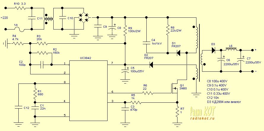 базе ШИМ UC3842. Поскольку схема базовая, выходные параметры БП могут быть