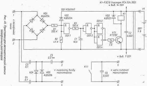 Принцип действия устройства заключается в следующем. Напряжение линии приложено к делителю R1, R2. Когда в линии 60В (трубка положена), на выходе DD1.1 нулевой уровень и, соответственно, на выходе DD1.3 также низкий уровень, транзистор VT1 закрыт, реле К1 обесточено, питание магнитофона выключено. При снятии трубки DD1.1 переключается, и через некоторое время задержки, определяемое R3 С1, реле К1 срабатывает, замыкая цепь питания магнитофона. После окончания разговора с такой же задержкой реле К1 отключается. Постоянная времени цепи R3, С1 значительно больше периода следования серии наборных импульсов, а также импульсов вызова АТС, поэтому реле К1 не срабатывает в режимах вызова и набора номера. Однако, если снять трубку и некоторое время не набирать номер, С1 заряжается и магнитофон включается. На ленту будут записаны «щелчки» набора. Желательно последовательно с СЗ, С4 включить сопротивления с номинала ми от 100 до 300 кОм, а уровень записи магнитофона соответствен но отрегулировать.