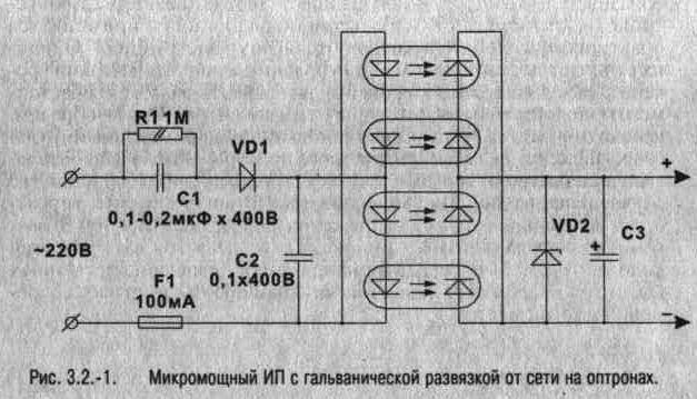 Микромощные ИП с гальванической развязкой от сети ~220 В можно выполнить с применением оптронов, включив их последовательно для увеличения выходного напряжения (рис. 3.2-1.). Перенос энергии осуществляется посредством однонаправленного светового потока внутри оптрона (оптрон содержит светоизлучающий и поглощающий элементы), таким образом, гальванической связи с сетью не возникает. На одной оптопаре