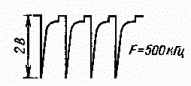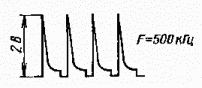 Рис.1 частоты в интервале 7,5...23,5 МГц, а изменив намоточные данные катушки L3, можно расширить интервал до 5..31 МГц. На вход синтезатора от гетеродина приёмника поступает синусоидальный сигнал амплитудой 0,3...2 В и частотой 500 кГц. На каждом из двух выходов синтезатора амплитуда выходного сигнала - примерно 1,7 В. Один выход используется для подключения смесителя приёмника, а другой - для смесителя передающей приставки или цифровой шкалы. Входной сигнал частотой 500 кГц усиливается каскадом на транзисторе VT1. Этот каскад имеет высокое входное сопротивление, что мало шунтирует выход кварцевого гетеродина. Диод VD1, являясь нелинейным элементом, способствует возникновению множества высших гармоник сигнала, которые необходимы для получения сетки частот и на которых, собственно, и будет происходить синхронизация сигнала. Далее положительные импульсы дифференцируются цепочкой C3R5 превращаются в очень короткие импульсы, их длительность не должна превышать половину периода синхронизируемого генератора. Затем импульсный сигнал поступает на затвор транзистора VT2. На его выходах присутствуют противофазные сигналы, которые поступают на импульсный фазовый детектор на диодах VD4-VD7. Во время действия импульса эти диоды открываются, и конденсатор С9 на короткое время оказывается соединенным с выходом синхронизируемого генератора, сигнал с которого на фазовый детектор поступает через эмиттерный повторитель на транзисторе VT3. По отношению к некоторому первоначальному значению, задаваемому делителем R9R10 (предварительное смещение варикапа VD8), напряжение на конденсаторе изменяется на значение напряжения, поступающего в данный момент с синхронизируемого генератора. Постоянная времени цепи C7R8 выбрана такой, чтобы в паузах между открывающими импульсами диоды VD4-VD7 были закрыты. Диод VD3 шунтирует выходы парафазного каскада, что благоприятно сказывается на симметричности противофазных сигналов, отрицательные импульсы обостряются и становятся идентичными по амплитуде и форме с импульсами положительной полярности, что хорошо заметно на осциллограммах. Осциллограмма импульсов, снятая в точке соединения катодов диодов VD4 и VD5, показана на рис. 2, а в точке соединения анодов VD6 и VD7 - на рис. 3.