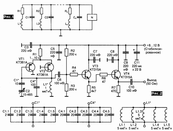 Поскольку речь идет об обычных LC автогенераторах в состава ГПД, такое "запараллеливание" ряда LC контуров преследует определенную цель. Как показывает практика, нестабильность частоты генерируемых колебаний a LC генераторах обусловлена нестабильностью (изменением) емкости и индуктивности, т.е. элементов колебательного контура под действием изменяющихся внешних условий (в первую очередь - температуры окружающей среды). Опыт свидетельствует, что даже небольшое изменение температуры среды приводит к некоторому изменению значений L и С колебательного контура, в результате чего и частота ГПД также изменяется. Но если конденсатор колебательного контура (постоянный конденсатор) собрать путем -запараллеливания- из конденсаторов с различными ТКЕ. то в результате можно получить такой конденсатор, емкость которого от температуры зависеть практически не будет. То же можно сказать и о катушке индуктивности. Таким образом, используя для построения LC контура различные типы конденсаторов (кроме блокировочных и им подобных) и различно выполненные катушки индуктивности (варьировался тип провода, каркас и пр.), автор увеличивал таким образом стабильность частоты генерируемых колебаний ГПД (иногда на порядок или даже более!). В результате такой ГПД уже в полной мере может удовлетворять современным требованиям к приемопередающей аппаратуре. Практически более 5...10 "запараллеленных" катушек индуктивности и такого же количества конденсаторов в ГПД по конструктивным и габаритным соображениям устанавливать нецелесообразно (хотя с точки зрения теории их увеличение должно приводить к повышению стабильности частоты генерируемых колебаний). Однако и такого количества L и C вполне хватает для заметного увеличения стабильности ЗГ ГПД! Такой подход к решению проблемы повышения стабильности ГПД был успешно реализован автором на практике. На рис.2 представлена исходная, выполненная практически, схема ГПД в которой для ЗГ использован нелинейный элементна VТ1VТ2 (негатрон с ВАХ соответствующего типа [1]). Используя идею, изложенную выше, выполнена трансформация исходной схемы в части C1*, C4* и L1*. Для расчета необходимых составных конденсаторов и индуктивностей использовались известные формулы для определения результирующих значений их параллельного соединения. Вначале было отобрано определенное количество специально предназначенных для частотозадающих цепей ГПД конденсаторов и индуктивностей с требуемыми согласно расчетам значениями и далее их соединяли параллельно согласно рис.2. Затем, придерживаясь общепринятой методики, «упаковали» такой ГПД и после 30-минутного прогрева проводили замер частоты через определенные промежутки времени. Если получалась недостаточная стабильность по сравнению с требуемой или с предыдущим вариантом, полностью меняли все детали колебательного контура на другие из числа предварительно отобранных (с теми же номиналами) и вновь повторяли указанные операции. Для более тщательной термокомпенсации на финальных стадиях возможно придется заменить только определенные конденсаторы, при этом надо иметь их достаточное количество, и с разными ТКЕ. Обычно 3...4 попытки (по опыту автора) уже приводят к хорошей стабильности ГПД. В результате проведенной трансформации частотозадающей цепи для данной схемы стабильность 