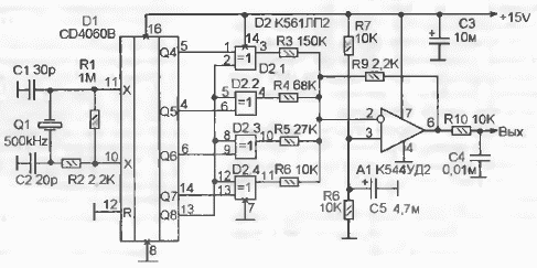 На рисунке 2 показана схема цифрового кварцевого синусоидального генератора, вырабатывающего синусоидальное напряжение частотой 976,5625 Гц (при частоте кварцевого резонатора 500 кГц). Здесь синусоидальное напряжение формируется из прямоугольных импульсов с помощью ЦАП на элементах микросхемы D2 и резисторах. Период состоит из 32-х ступенек. Окончательно выходной сигнал формируется операционным усилителем А1, и включённой на его выходе RC-цепочкой. которая сглаживает ступеньки, образующие синусоиду.