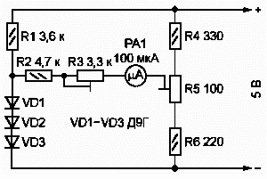 Электронный термометр, схема которого изображена на рис. 1, решает эту задачу. Датчиком температуры служат три соединенных последовательно полупроводниковых диода (VD1-VD3). Они могут быть любого типа - германиевыми или кремниевыми. Важно лишь, чтобы диоды были малогабаритными, это уменьшит инерционность прибора. Стабилизированное напряжение питания 5 В подают от любого подходящего источника. Потребляемый ток не превышает 10 мА. Я воспользовался блоком питания БП2-3 из комплекта калькулятора БЗ-34. Действие термометра основано на том, что падение напряжения на полупроводниковом диоде при неизменном прямом токе линейно зависит от температуры его р-n перехода. Если при нулевой температуре движок подстроечного резистора R5 установить таким образом что напряжение между ним и минусом источника питания равно падению напряжения на диодах VD1-VD3, ток через микроамперметр РА1 в этих условиях отсутствует. С нагревом диодов напряжение на них уменьшается и через микроамперметр потечет ток пропорциональный температуре. Рамка использованного автором микроамперметра сопротивлением Rp=617 Ом изготовлена из медного провода (температурный коэффициент сопротивления a=4.3*10-3 °С-1). При изменении температуры рамки на dT=20 °С прирост её сопротивления составит dR = Rp*a dT = 617*4,3-3*20=53 Ом Так как динамическое сопротивление диодов VD1-VD3 мало и номиналы резисторов R4-R6 невелики, ток, текущий через микроамперметр РА1 при заданной температуре, зависит в основном от суммы сопротивлений R2, R3 и Rp. В данном случае она приблизительно равна 7 кОм. Составив пропорцию 7000 Ом - 100 %, 53 Ом - х %, найдём X=53*100/7000=0.76% Следовательно, при колебаниях температуры в месте установки микроамперметра РА1 на 20 °С показания термометра будут изменяться менее чем на 1 %. А вот если оставить в схеме один диод, для сохранения прежней чувствительности прибора придётся уменьшить суммарное сопротивление резисторов и рамки в три раза, поэтому погрешность утроится. Градуируют термометр в следующей последовательности: - погрузив диоды VD1-VD3 в сосуд с тающим льдом (снегом), подстроечным резистором R5 устанавливают стрелку микроамперметра РА1 на нулевую отметку шкалы; - погрузив диоды в сосуд с кипящей водой, подстроечным резистором R3 устанавливают стрелку на отметку 100 °С.