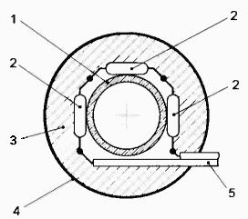 Остается закрепить диоды на трубе, по которой течёт горячая вода, как можно ближе к месту, где нужно контролировать ее температуру. Возможный вариант крепления показан на рис. 2. Чтобы температура диодов 2 не отличалась от температуры трубы 1 и воды в ней, узел следует покрыть асбестовой теплоизоляцией 3, а поверх неё - алюминиевой фольгой 4. Проводами 5, длина которых практически не ограничена, диоды 2 соединяют с остальными элементами термометра, которые можно разместить вблизи регулятора газовой колонки, даже находящейся в другом помещении. В. БУРКОВ, г. Иваново