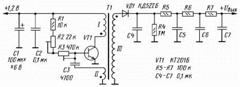 Микромощный преобразователь для питания варикапа РАДИО 2004 №3 В журнале "Радио", 2001, № 5, с. 54 на рис. 4 была приведена схема преобразователя напряжения на базе блокинг-генератора, предложенная В. Поляковым и проверенная им при питающем напряжении 6 В. Мною было проведено испытание этого преобразователя при напряжении питания 1,2 В (от одного никель-кадмиевого аккумулятора) Трансформатор Т1 был выполнен точно по описанию статьи. Для удобства использования были произведены некоторые доработки схемы: параллельно входу, для уменьшения импульсных наводок по питающей цепи, подключены оксидный конденсатор С1 и керамический С2 (см. рисунок).