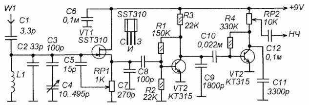 Принципиальная схема приёмного тракта такого типа, выполненного на более современной элементной базе показана на рисунке. Первый усилительный каскад выполнен на полевом транзисторе VT1. Входной сигнал выделяется контуром L1-C2-C3-C4 и поступает на его затвор. Транзистор включён по схеме с общим стоком Положительная обратная связь осуществляется с затвора на исток через конденсатор С5. Глубина ПОС устанавливается переменным резистором RP1, регулирующим степень связи через С5 между затвором и истоком VT1. Конденсатор С7 снижает вероятность неконтролируемого самовозбуждения. На транзисторе VT2 выполнен второй каскад усиления, по схеме с общим эмиттером. С9 необходим для уменьшения склонности каскада к самовозбуждению. Третий каскад на транзисторе VT3 выполняет функции третьего каскада УРЧ и детектора. Продетектированный сигнал фильтруется конденсатором С11. Резистор RP2 служит регулятором громкости. С него сигнал можно подать на вход любого УНЧ. Приёмник охватывает два радиовещательных KB диапазона, - 41 и 49 метров. В качестве контурной катушки L1 используется готовый высокочастотный дроссель индуктивностью 5 мкГн. Катушка не подстраивается. Переменный конденсатор С4 - одна секция переменного конденсатора 2х10...495 пф с воздушным диэлектриком. Такие конденсаторы использовались в ламповых радиолах и приёмниках. Если нет именно такого, - сойдет любой другой от приёмника. Но желательно, всё же, с воздушным диэлектриком. Если это будет популярный конденсатор ёмкостью 2х5...260пф нужно обе его секции включить параллельно. Или соответствующим образом изменить С3. Антенна, - отрезок монтажного провода длиной около двух метров. Транзисторы КТ315 можно заменить на КТ3102, транзистор SST310 на J310, Т310 или КП302, КП303. Эксперименты по приёму KB проводил в сельской местности (район Ладожского озера). В ночное время был возможен приём многих дальних КВ-радиовещательных станций. Иванов А.