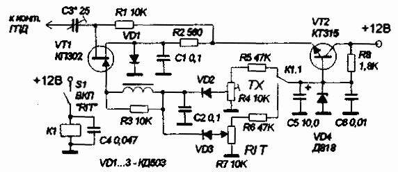 ![]() Предлагается схема электронной расстройки ГПД, рис.1, которая, на мой взгляд, прошла мимо внимания большинства радиолюбителей [1]. Используя такой способ перестройки частоты обеспечивается меньший первоначальный выбег частоты и меньший ее уход при длительной работе. На частоте 7МГц расстройка может составлять 250 кГц, в зависимости от схемы ГПД. Если не нужен большой диапазон расстройки, то следует исключить элементы VD1, R2, С1, а исток транзистора VT1 следует соединить с землей. Термокомпенсация В процессе нагрева детали ГПД изменяют свои размеры и, в зависимости от суммарного температурного коэффициента, и его знака частота ГПД начинает дрейфовать вверх или вниз. Термокомпенсацию следует производить при выведенном наполовину конденсаторе переменной емкости. От угла поворота роторных пластин зависит его ТКЕ (температурный коэффициент емкости). Нагревать корпус ГПД следует равномерно, желательно в термостат, контролируя температуру внутри термостата. Если нет промышленного термостата, можно сделать самодельный из деревянного ящика, а элементами нагрева могут служить лапы накаливания, рефлекторы, маломощные калориферы и т.п. Нагрев, при этом, будет менее равномерным. Нагревая корпус ГПД до температуры (40 - 50)° и, охлаждая естественным путем без принудительной вентиляции, проверяется цикличность изменения частоты. Если установившееся значение частоты после цикла нагрев-охлаждение отличается от исходного на 200 - 350 Гц, необходимо отыскать и заменить деталь с не цикличным температурным коэффициентом. Некоторые детали обладают свойством под действием температуры скачком изменять свои параметры. Чаще всего это конденсаторы, особенно, трубчатые - КТ. Происходит "мерцание" частоты. Существует простой способ - нагревая паяльником, с вставленным вместо жала керамическим стержнем, поочереди все детали, входящие в ГПД, и прослушивая сигнал ГПД на радиоприемнике (например, Р-326М) можно найти неисправную деталь. При нагреве исправных деталей изменение частоты происходит плавно, без скачков и "мерцания". Иногда, мерцание может возникнуть вследствие механической неустойчивости монтажа. Подбором термокомпенсирующих конденсаторов с нужным ТКЕ добиваются ухода частоты не более чем на 10 - 20 Гц/град при нагреве корпуса ГПД. Массивный дюралюминиевый корпус обладает тем большей тепловой инерцией, чем толще его стенки и тем лучше стабильность ГПД. Контроль частоты не следует производить раньше чем через 15-20 минут после пайки в ГПД. Стабильность частоты проверяют при постоянной температуре в крайних положениях конденсатора переменой емкости. После 15 минутного прогрева она не должна быть хуже, чем 50-100 Гц/час. Термокомпенсацию можно считать законченной, если при перестройке ГПД с одного конца диапазона в другой уход частоты меняет знак, т.е. в начале она от прогрева растет, в конце уменьшается или наоборот. Убедившись, что процесс происходит именно таким образом, можно смело устанавливать ГПД в трансивер. Следует также позаботиться о термокомпенсации источника питания. Конструирование традиционного ГПД Конструирование ГПД - тема необъятная, но основные принципы следует привести. Считаю, что это будет полезным не только для начинающих радиолюбителей. Стабильность частоты - серьезная проблема для большинства радиолюбительских конструкц
