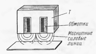 Рис. 1 Принцип действия прибора прост (рис. 1). Если у трансформатора, магнитопровод которого собран "встык", удалить замыкающие пластины, а вместо них приближать к Ш-образным пластинам ферромагнитный материал, напряжение на вторичной обмотке будет увеличиваться и станет максимальным, когда материал практически замкнет пластины. Как было установлено опытным путём, наибольшая чувствительность такого датчика лежит в указанных выше пределах при условии, что на первичную обмотку поступает напряжение частотой 30...50 Гц.