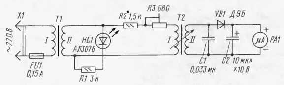 Рис. 2 Прибор питается от сети переменного тока через понижающий трансформатор Т1 (рис. 2). Индикатор включения - светодиод HL1, ток через который ограничивает резистор R1. Напряжение со вторичной обмотки трансформатора подается через резисторы R2, R3 на первичную обмотку трансформатора Т2 - датчика прибора. Со вторичной обмотки напряжение поступает на выпрямитель, выполненный на диоде VD1. В зависимости от толщины лакокрасочного покрытия будет изменяться значение выпрямленного напряжения. Толщину определяют по отклонению стрелки индикатора РА1. На условный нуль отсчёта её устанавливают переменным резистором R3. Трансформатор Т1 - любой малогабаритный, мощностью около 5 Вт с напряжением на вторичной обмотке 10...12 В, светодиод - любой из серии АЛ307, диод - серии Д9 либо маломощный выпрямительный, резисторы и конденсаторы - любого типа, стрелочный индикатор - с током полного отклонения стрелки 50 мкА.