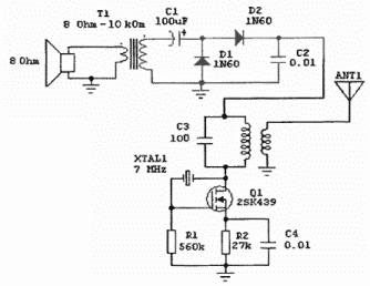 Детекторный... передатчик Радиомир КВ и УКВ 2008 №1Всем хорошо известен детекторный радиоприёмник. Его главное достоинство в том, что для работы не требуется источник электропитания. Приёмник работает за счет наводимой в приёмной антенне энергии радиостанции. Известны также модификации такого приёмника, когда продетектированный сигнал усиливается простым УНЧ. Питается этот УНЧ, опять же, за счёт энергии от принимаемой радиостанции. Наверняка вы задумывались: а нельзя ли изготовить радиопередатчик без источника электропитания? Оказывается, вполне можно. Такой передатчик давно уже был изготовлен и даже использовался спецслужбами для скрытого подслушивания разговоров. Сигнал с миниатюрного пьезомикрофона напряжением в несколько десятков микровольт поступал на туннельный диод, включенный в колебательный контур. Диод играл роль генерирующего элемента, поскольку в его вольтамперной характеристике имеется участок с отрицательным сопротивлением. Мощность такого передатчика составляла несколько микроватт. Обычно он изготавливался в виде булавки с круглой головкой, в которую была вмонтирована сама схема и микрофон. Антенной служила металлическая игла этой "булавки" длиной 40-50 мм. Такие "жучки" работали на частотах около 1 ГГц, и сигналы от них могли быть приняты высокочувствительным приёмником на расстоянии 30-50 м. Однако до сих пор в любительской связи не были известны аналогичные, не требующие источника питания, передатчики. Но недавно энтузиаст "экстремальной" QRP-связи Kazuhiro Sunamura, JF1OZL, изготовил такой передатчик. Как видно из схемы, переменное напряжение от микрофона повышается НЧ трансформатором и поступает на выпрямитель, выполненный по схеме удвоения напряжения. При громком разговоре постоянное напряжение достигает 2 В. Этого достаточно для питания схемы простого кварцевого генератора.