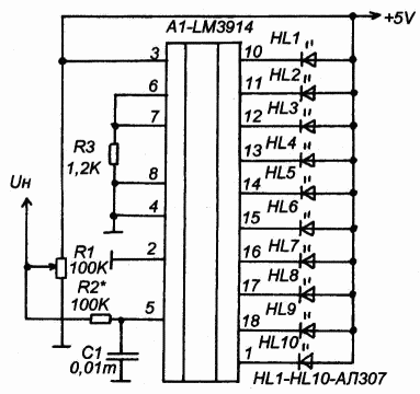 ЭЛЕКТРОННАЯ ШКАЛА ДЛЯ РАДИОПРИЁМНИКОВРадиоконструктор 2003 №10Радиолюбительское конструирование довольно специфическое хобби, по тому что, радиолюбителю намного проще спаять сложную схему, чем сделать простое механическое устройство. Наглядный пример - конструирование радиоприёмника. Вся схема может быть очень хорошо собрана и отлажена, но шкально-верньерное устройство всё портит. Требуются какие-то шкивы, ролики, пружинки. А взять их негде. Приходится что-то подбирать, что-то подтачивать, подпиливать использовать детали от детского конструктора, поломанного будильника, и т.п. В результате получается неказистая и крайне не долговечная конструкция, которая всё время скрипит и заедает. К тому же, времени на неё уходит в несколько раз больше, чем на сборку, монтаж и налаживание самой схемы. Конечно, можно сказать, что необходимо освоить "параллельные специальности", но мы же "электронищики", а не "механики". Поэтому нам проще собрать электронную схему чем механический верньер. Используя многооборотные переменные резисторы (такие, как применялись в узлах фиксированных настроек советских цветных телевизоров) и микросхемы шкальной индикации типа LM3914 можно сделать неплохое электронно-механическое верньерно-шкальное устройство для самодельного радиоприёмника, которое будет надёжным, современным и очень простым (с точки зрения радиолюбителя, конечно).