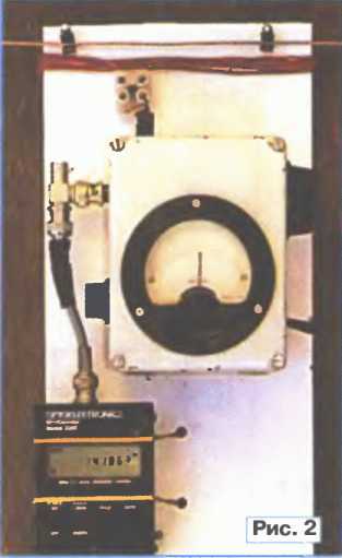 Рис. 2 Конструктивное отличие от традиционных вариантов исполнения ГИР состоит в том, что автор применил катушку больших размеров, которая позволила обеспечить заметную связь с элементом антенны, резонансную частоту которого надо измерить (рамкой или линейным вибратором). Внешний вид его прибора приведен на рис. 2. Его основанием служит диэлектрическая пластина шириной 150 и толщиной 15 мм. Длина её некритична — зависит от размеров коробки, в которой размещаются элементы ГИР, и от размеров частотомера. Автор использовал частотомер заводского изготовления. В верхней части этой пластины намотана катушка, которая содержит пять витков провода диаметром 1 мм в изоляции. Её индуктивность получилась около 3 мкГн, что обеспечило перекрытие ГИР при использованном КПЕ от 12 до 22 МГц. Изменяя число витков, можно получить и другое, требуемое для настройки конкретной антенны, перекрытие по частоте. В верхней части пластины размещены два диэлектрических крючка (из тех, что используют для крепления электропроводки), которыми прибор подвешивают на проволочный элемент антенны. Это позволяет зафиксировать взаимное положение катушки ГИР и этого элемента, что также повышает точность измерений. Часть проволочного элемента антенны будет параллельна длинной стороне прямоугольных витков катушки. Это, как показала проверка, обеспечивает достаточно сильную связь катушки ГИР с элементом антенны и надёжную регистрацию его резонансной частоты. Так, при работе с рамками "двойного квадрата" изменение показаний измерительного прибора при резонансе составляло примерно 40% от всей шкалы.