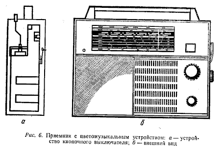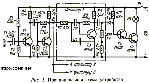 Настройка цветомузыкального устройства сводится к подбору оптимальных режимов всех каскадов и полос пропускания трех фильтров. Резистором R1 устанавливают коллекторный ток транзистора Т1, равный 0,3 мА, резистором R4 подбирают коллекторный ток транзистора Т2, равный 0,5—0,8 мА. Затем устанавливают коэффициент усиления фильтров одинаковым для всех трех каналов. Полосу пропускания фильтров подбирают при помощи резисторов R10 и R11, вместо которых на время настройки ставят потенциометр. Наконец в режиме молчания приемника подбирают резистор R12 таким образом, чтобы лампа Л1 была на пороге загорания. В заключение хочется отметить сравнительно небольшой потребляемый ток (50—60 мА при напряжении 9 В), который позволяет успешно использовать описанное устройство в переносных приемниках, имеющих источники питания большой емкости. Е. КРИНИЧНЫЙ, В помощь радиолюбителю, №58, с.27 -31