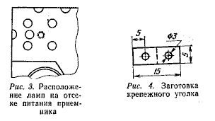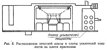 Усилители мощности собирают на отдельной плате размером 60х25х2 мм. Эту плату приклеивают к печатной плате радиоприемника и к шасси, как показано на рис. 5. На этом же рисунке показано расположение печатной платы на шасси радиоприемника.