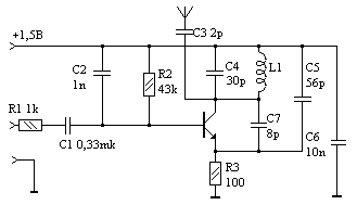 Этот РМ начинает работать уже при напряжении питания 0,8 В, при этом ток потребления составляет 0,5 мА с дальностью излучения 50 метров. Задающий генератор VT1(КТ315) выполнен по схеме емкостной трехточки. Положительная обратная связь определяется конденсатором С7. Выходной контур С4L1 настраивается на частоту около 94 мГц подбором конденсатора С4 и сдвигом витков катушки L1. Режим по постоянному току генератора задается резистором R3. Катушка L1 выполнена бескаркасной с диаметром намотки 6 мм и имеет 8 витков, намотанных в ряд проводом ПЭЛ-0,35. В качечтве ВМ1 желательно применить микрофон "Сосна". Поскольку устройство, собранное по этой схеме, имеет минимальный уровень излучения, его удобно применять в тех случаях, когда нежелательно дальнее распрстранение радиосигнала для улучшения маскировки, а также для затруднения обнаружения поисковой аппаратурой.